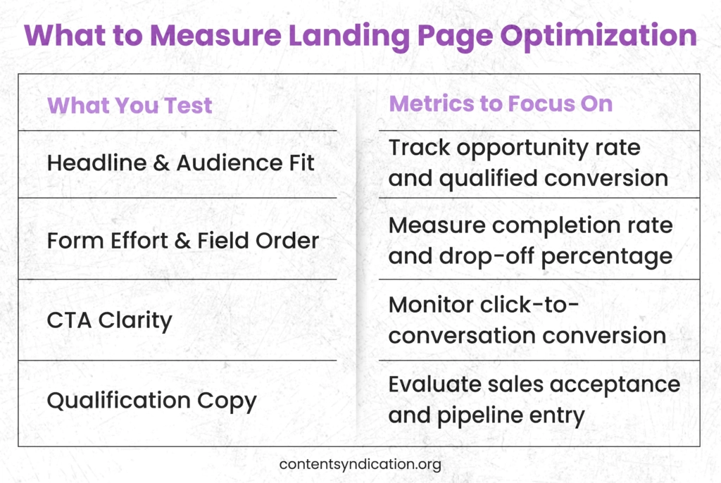 Success should be measured using sales acceptance, pipeline influence, and conversion velocity, the true indicators of syndication landing page optimization.