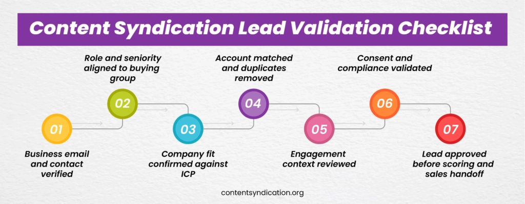 A structured content syndication lead validation checklist examines identity, role relevance, company attributes, consent compliance, and engagement context to determine whether a lead is actionable.