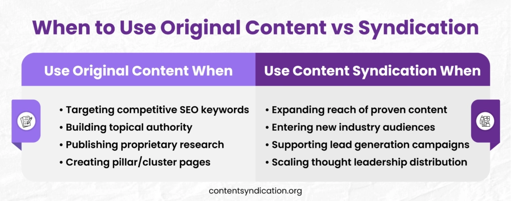 Original content strengthens brand authority and search rankings, while syndication expands reach through external audiences. When executed correctly, both approaches complement each other. When executed poorly, they can compete for search visibility.
